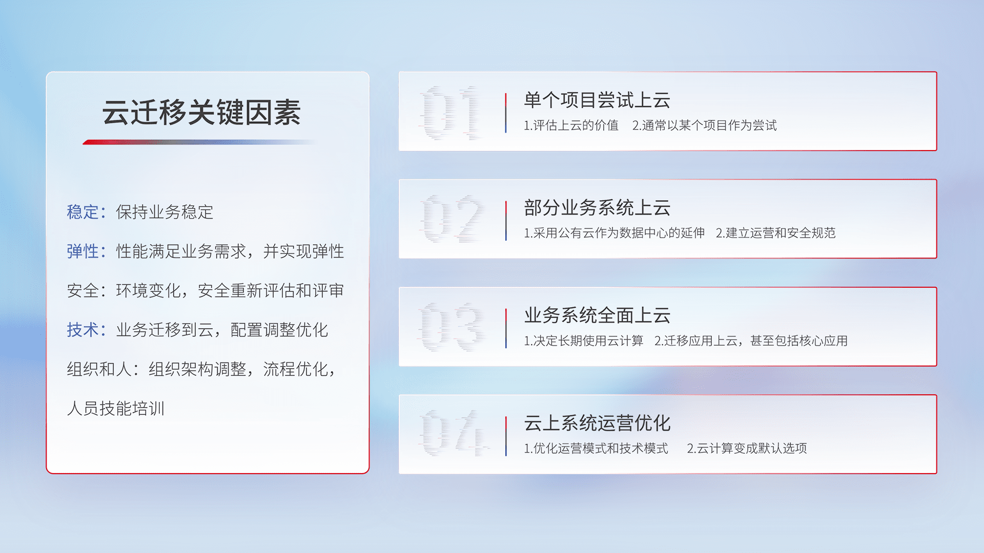 结合实际业务,,,从规划设计、、云平台选型、、云原生改造、、、数据迁移、、、、集成交付,,,迁移全过程为客户识别最佳上云路径,,,,做好风险识别管理,,设计网络架构、、、身份权限、、、安全审计合规、、、、操作审计、、日志审计、、、监控告警策略、、、、多站点容灾设计等,,,对云上基础设施进行整体规划,,提升IT治理水平,,,,以满足弹性、、高可用、、、高性能的需求。。