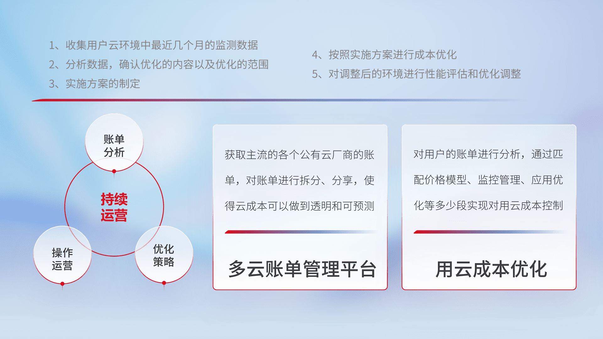 通过多云纳管,,,以统一的资源数据模型把客户的云资源进行抽象和封装,,,进而实现对多云资源的统一操作,,保障云资源管理的可靠性、、、、稳定性与可用性。。。。量身定制化运维内容,,,,配置、、、、开发运维、、、、补丁管理、、备份、、监控、、认证和访问管理、、审计和日常巡检等,,,,保障在用云过程中的可靠度,,,稳定度以及高可用率。。